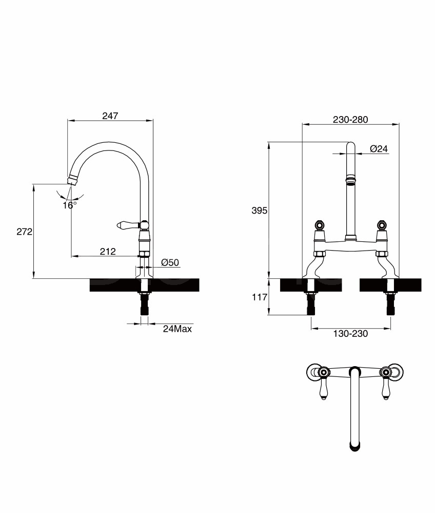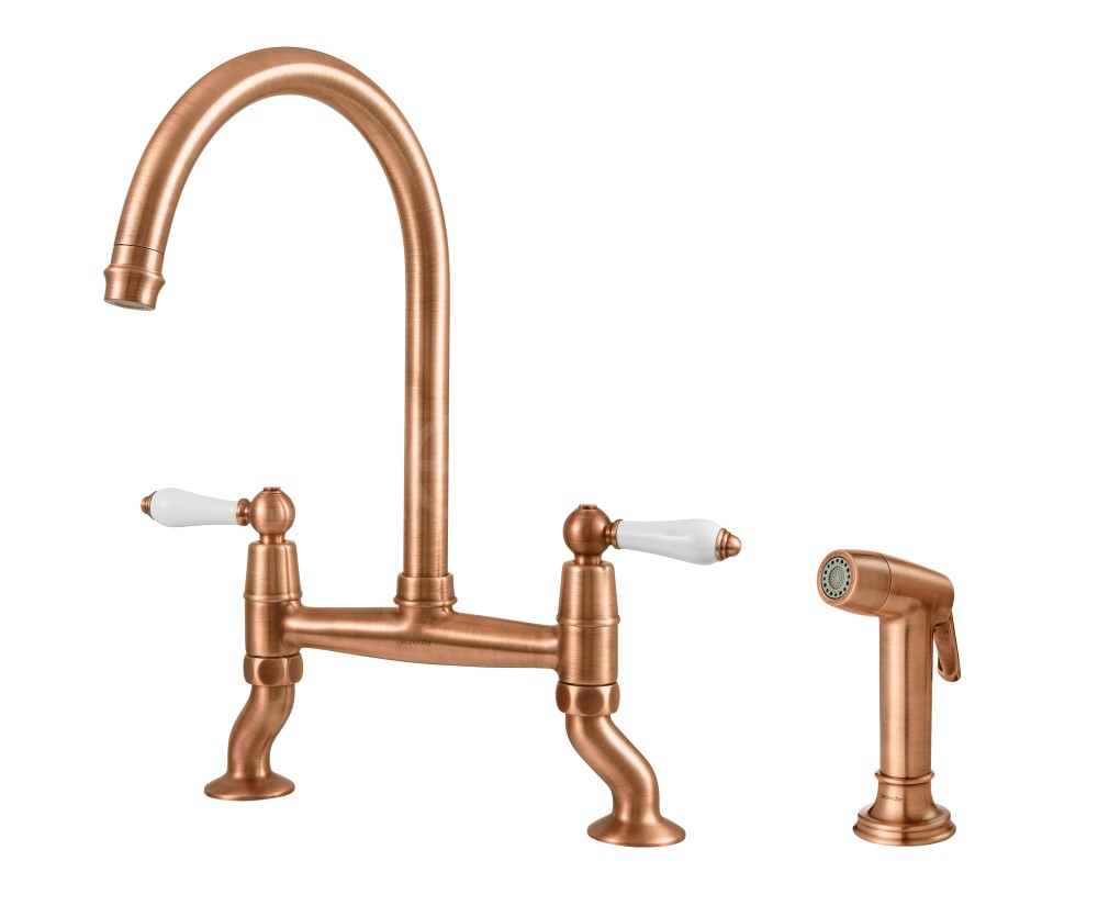 The Elegance Bridge with Rinse tap blends classic Victorian styling with practical modern functionality, creating a striking focal point for traditional kitchen spaces. Featuring elegant ceramic lever handles and a tall swan-neck spout, the distinctive bridge design complements apron front, Belfast and other traditional sink styles beautifully.