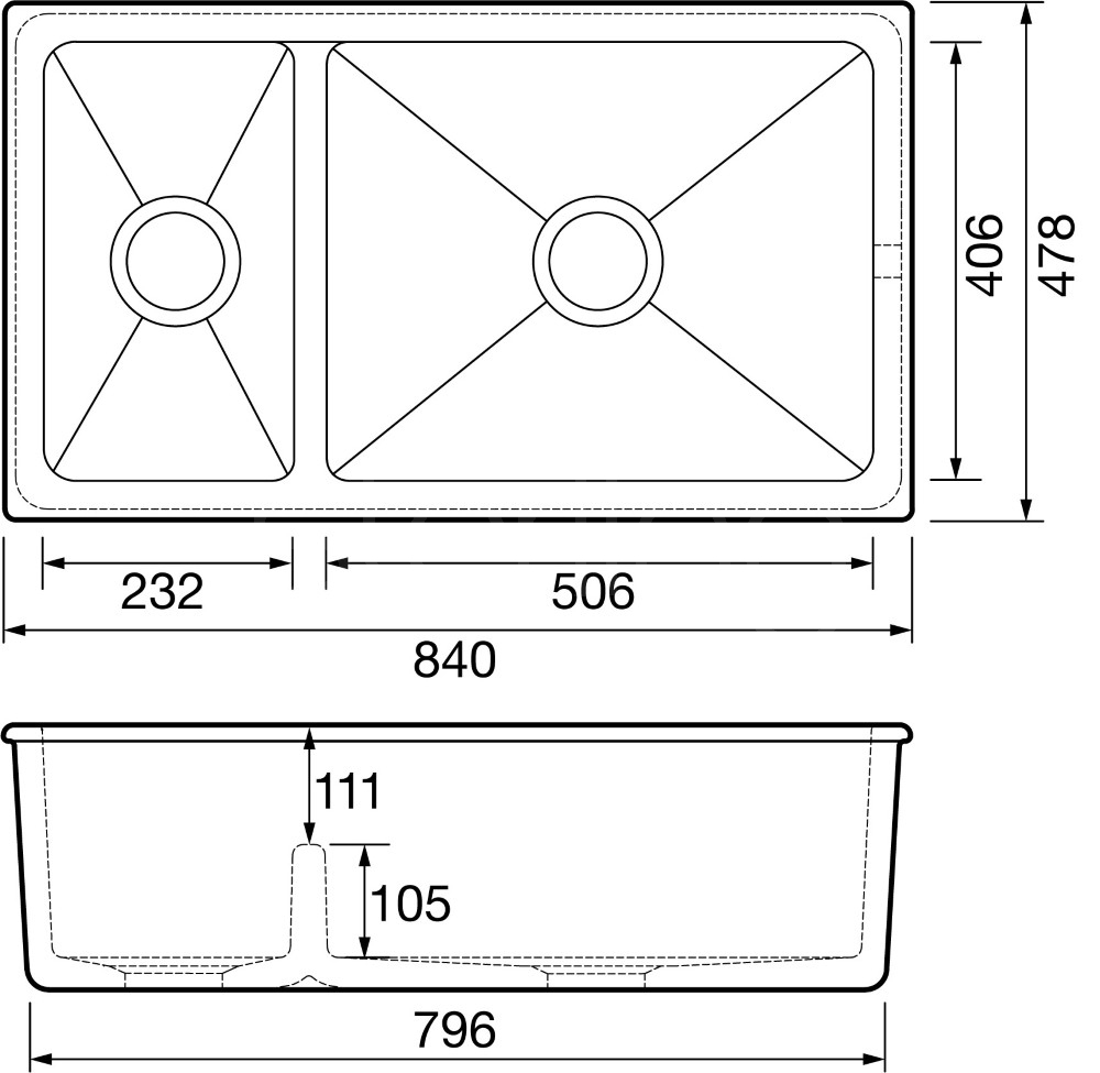 The expansive main bowl is designed to effortlessly accommodate professional-grade cookware, roasting trays, and baking sheets, while the generous secondary bowl is ideal for everyday washing and prep tasks. A distinctive low-profile partition offers exceptional versatility — use the bowls separately to save water, or allow them to overflow together to create one large, uninterrupted soaking area.